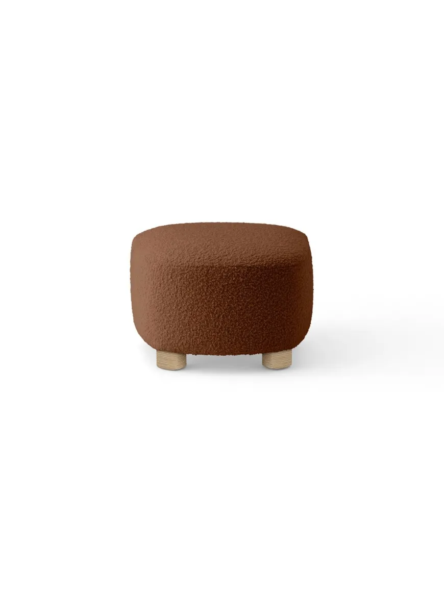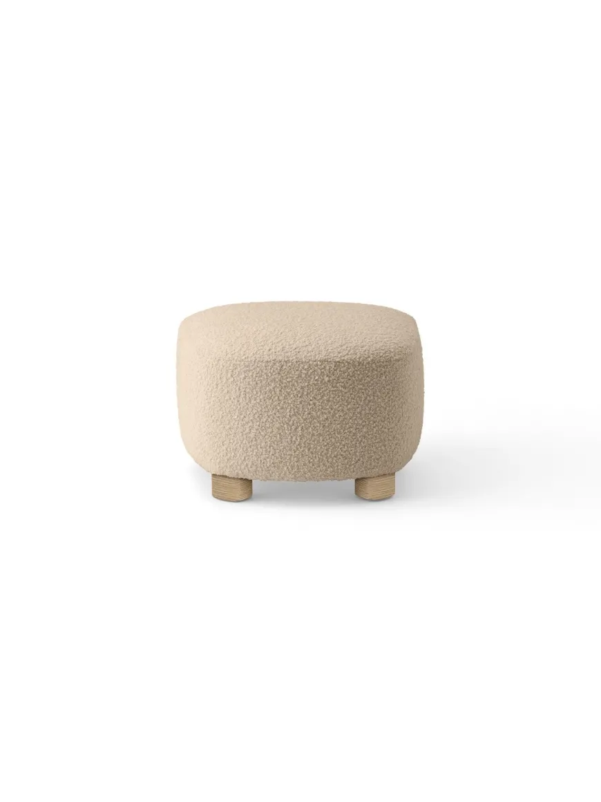 Den matchende fodskammel til Den Trætte Mand er nu polstret i Baena bouclé fra Limonta – Baena 14 (hvid). Den taktile bouclé fremhæver de bløde, afrundede linjer og gør skamlen til et naturligt supplement til lænestolen. Vælg ben i eg eller mørkbejdset eg, og nyd de forreste messinghjul som gør den let at flytte.