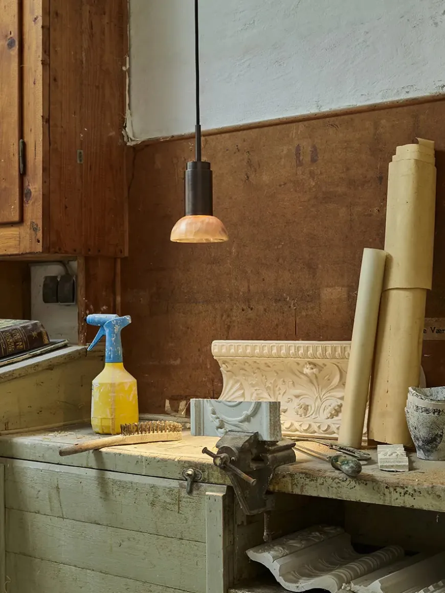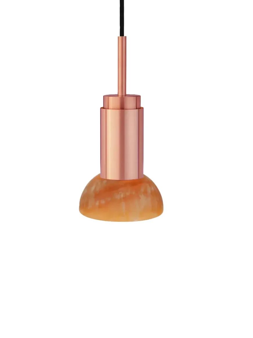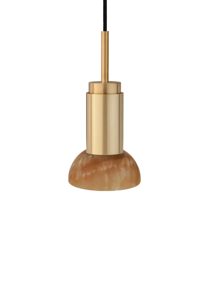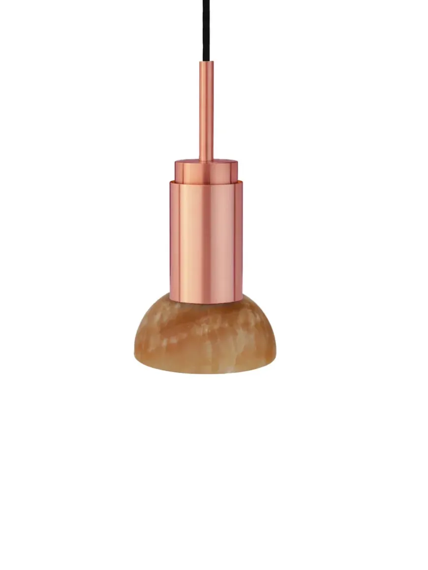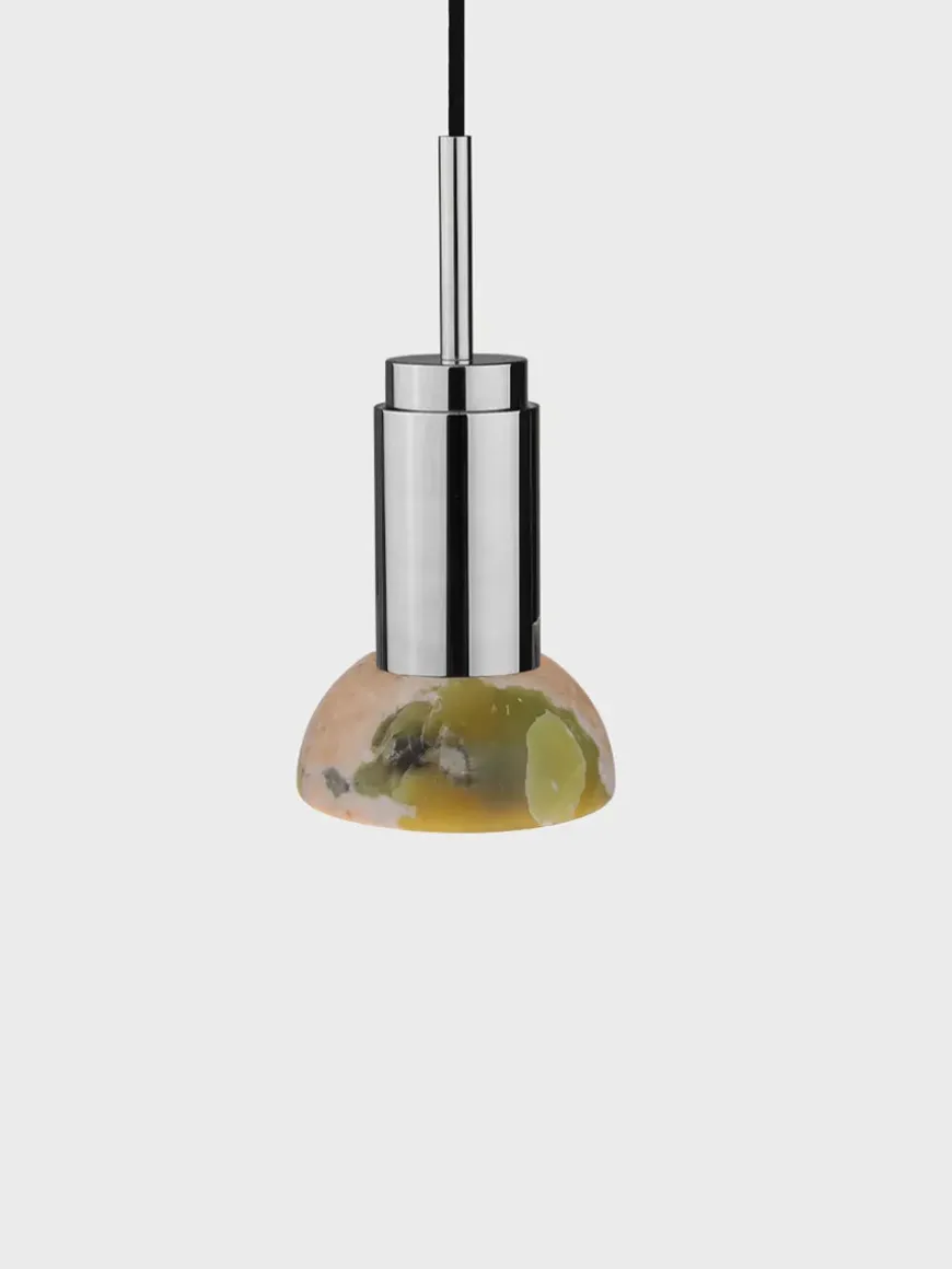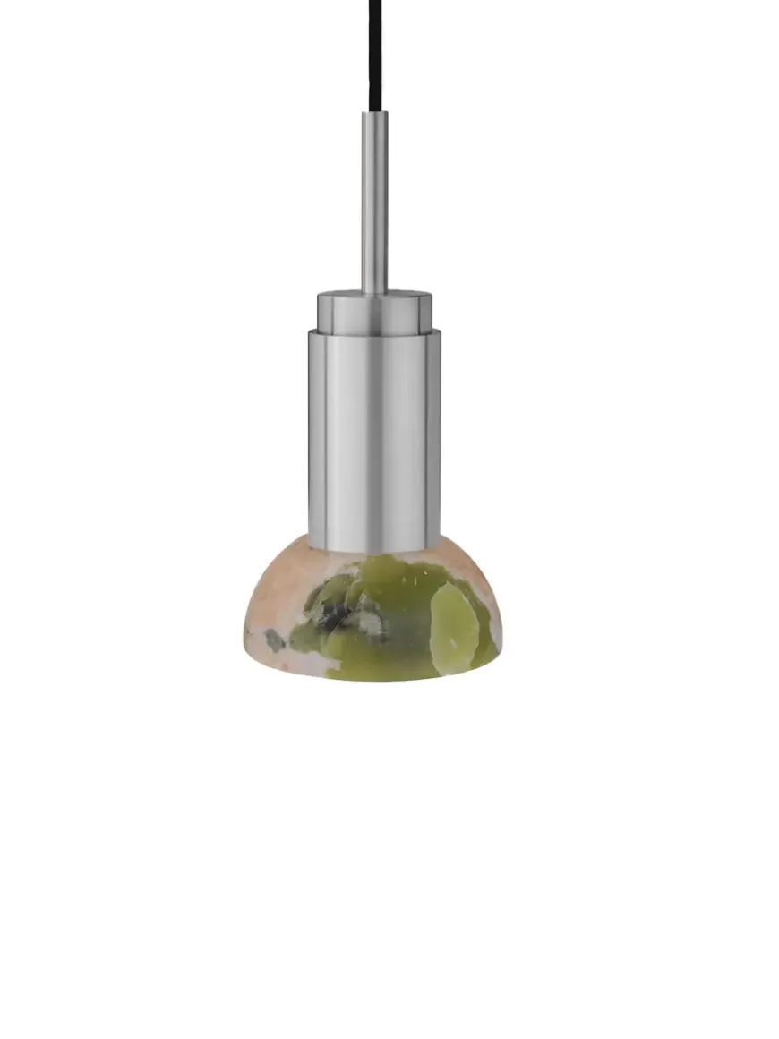 Nu fås Donya lampen fra Anour med skønne skærme i sten. Lampeskærmen her er i mixet Onyx og halvmåneformet. Onyx er en natursten, som er fyldt med harmoni og i skønne farver. Den grønne/orange/hvide skærm kommer med, hvad der ligner revner, som giver et skønt og diffust lys. Donya lampen er ideel at bruge over køkkenbordet eller til at sætte sammen flere og så hænge over spisebordet. Da skærmen er i natursten, vil hver eneste Donya ONYX Moon lampe være unik og helt sin egen. Donya lampefatningen kommer i mange forskellige finishes og materialer.