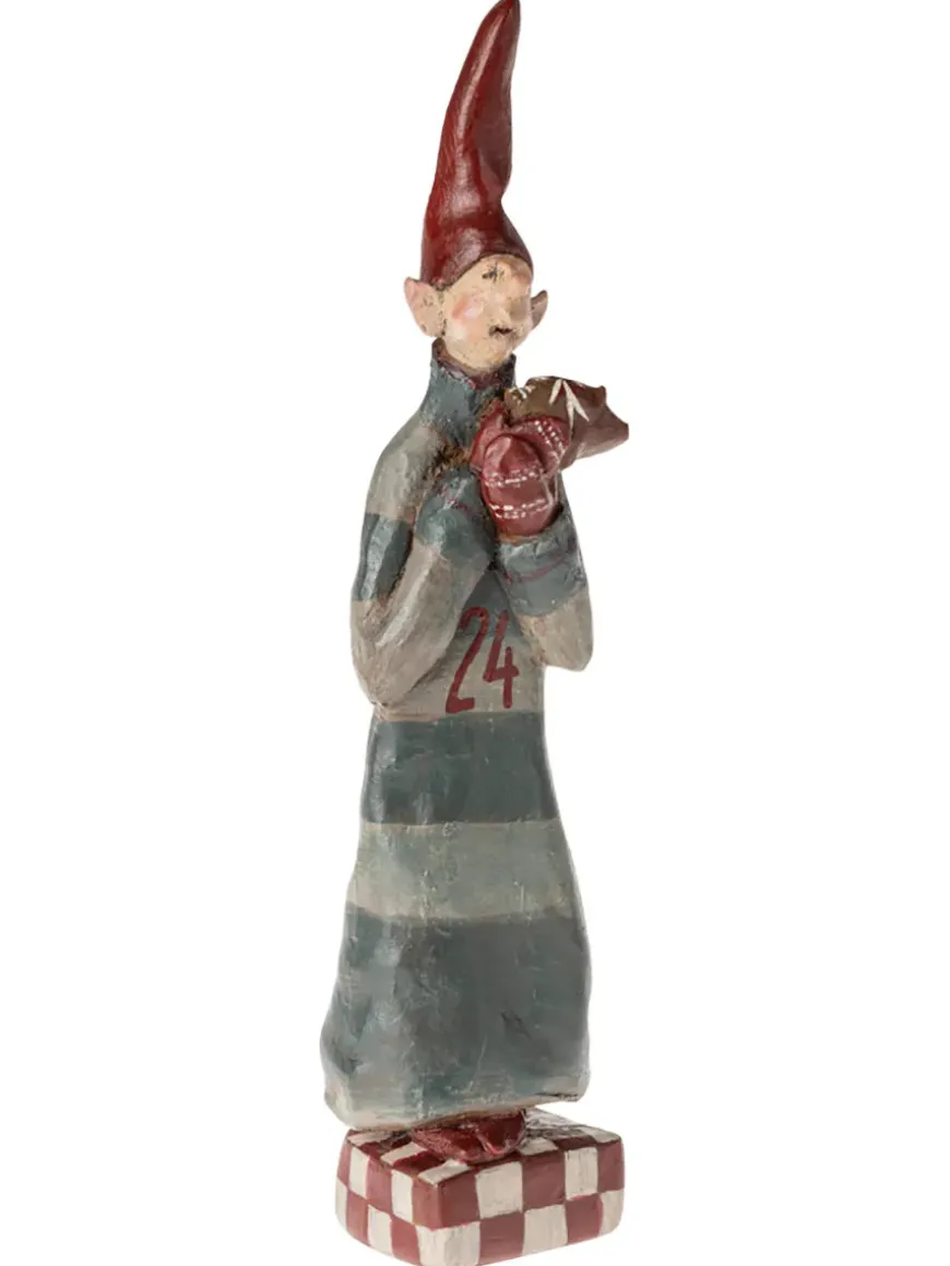 Et Maileg samleobjekt. Hvert år designer de en ny unik nisse. Denne smukke figur er formet i hånden og bagefter håndmalet. Hver figur har sit eget unikke udtryk og er pakket i en gaveæske. Her er det en fin nisse med en lille gris i hånden.