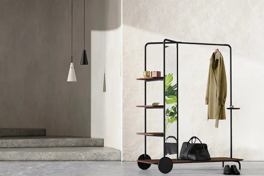 Host er en flytbar garderobe, der både er anvendelig og smuk at se på. Garderoben her er i valnøddefinér og pulverlakeret stålstel. Host garderoben er en meget stilsikker løsning i eksempelvis entréen som garderobemøbel eller i soveværelset. På Host Wardrobe er udover hylder og stang også spejl.
