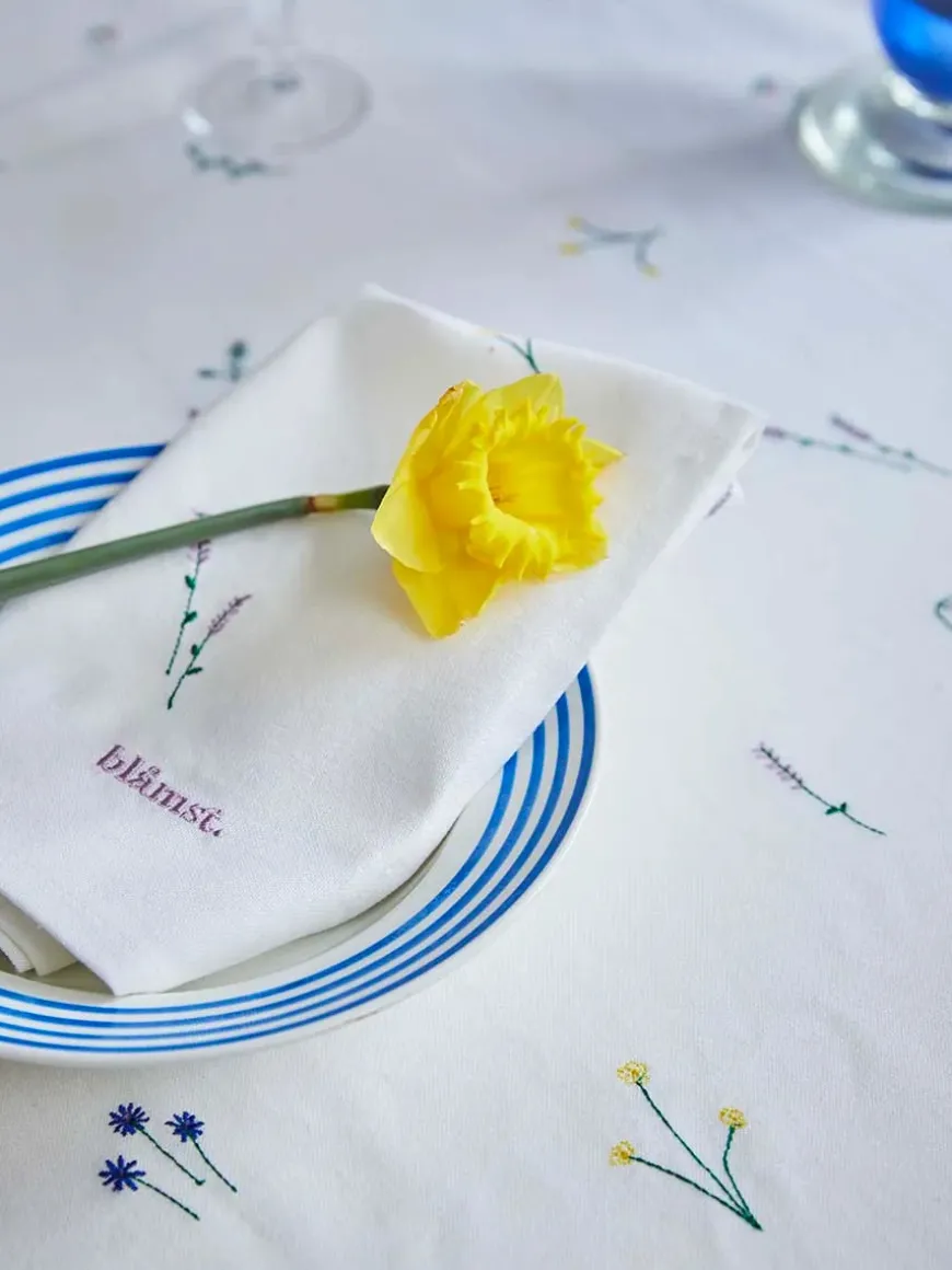 Giv dine måltider et strejf af havets charme med den smukke Hummer dug fra Blåmst. Dugen er lavet i blød, 100% økologisk bomuld og prydet med håndtegnede, broderede hummere – en unik detalje, der tilfører borddækningen liv og personlighed.