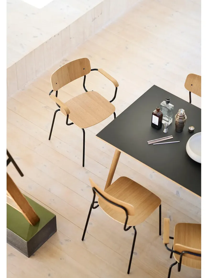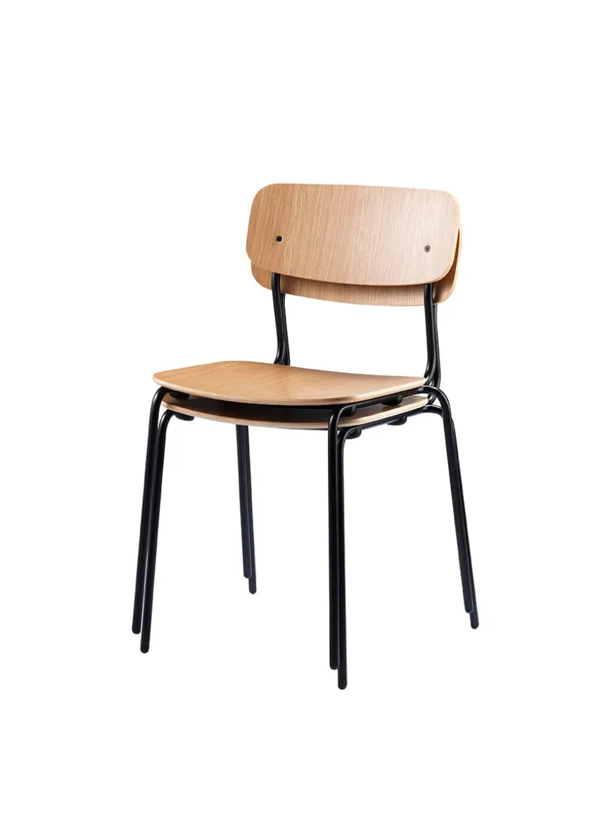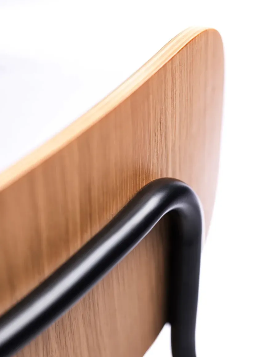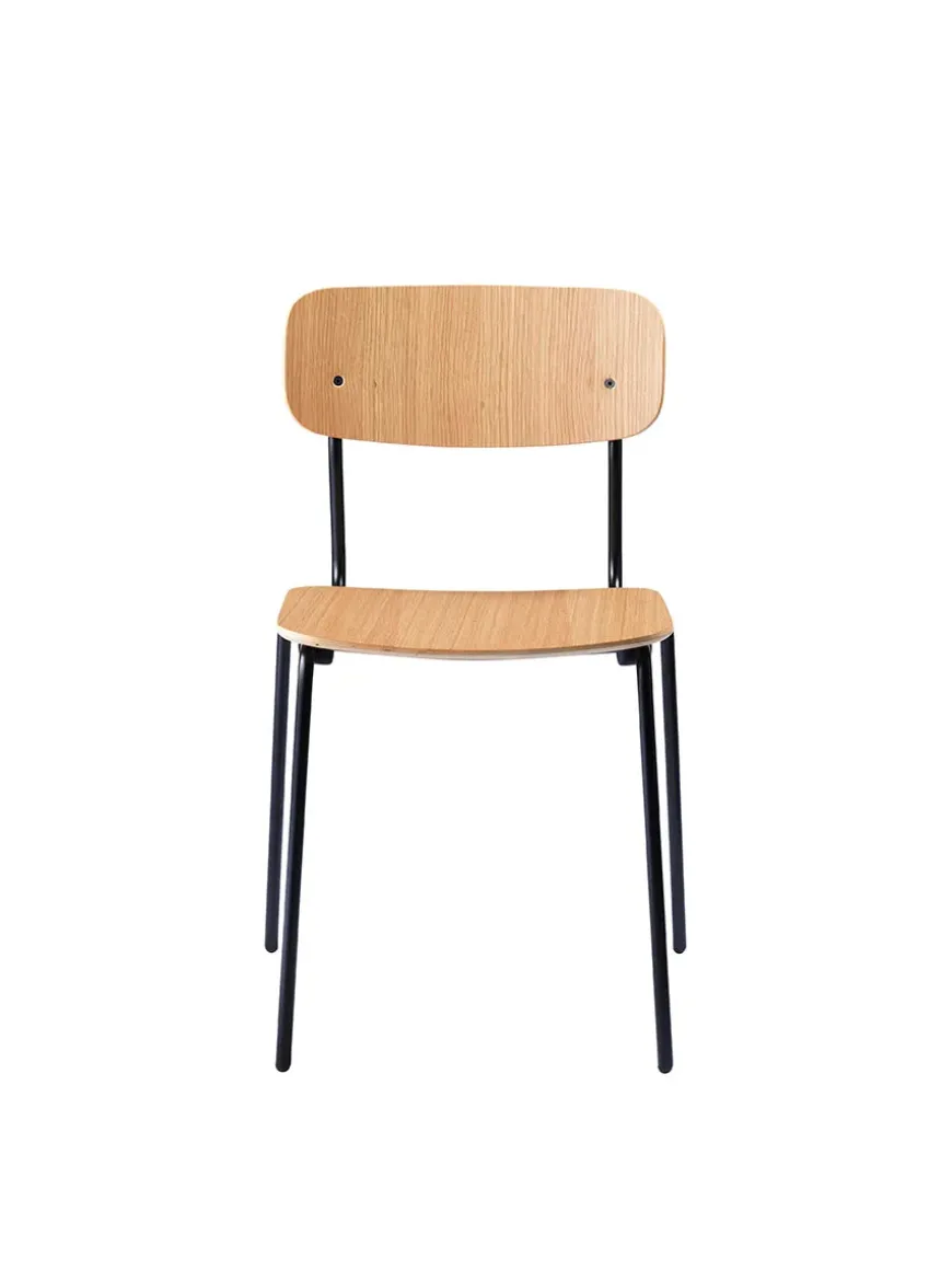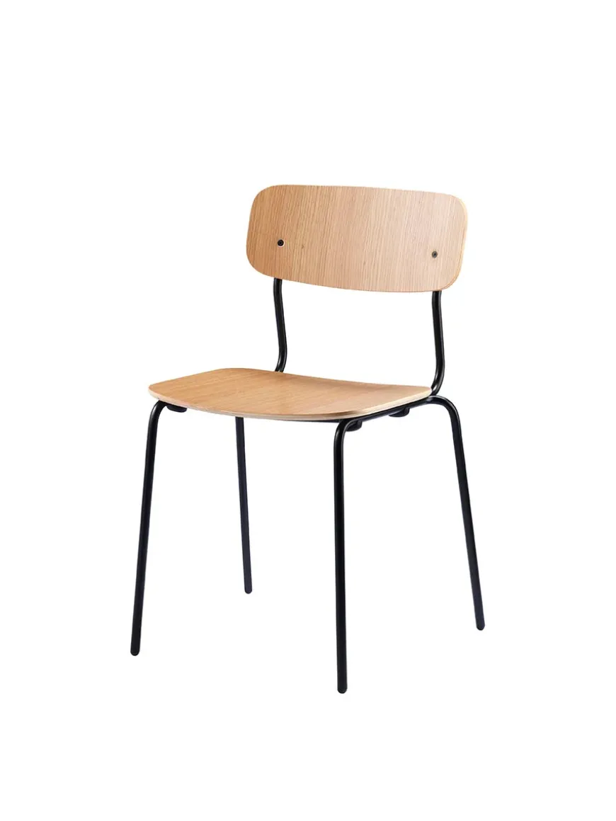 Stolens stel er i sort pulverlakeret stål og med sæde og ryg i egetræsfiner.
