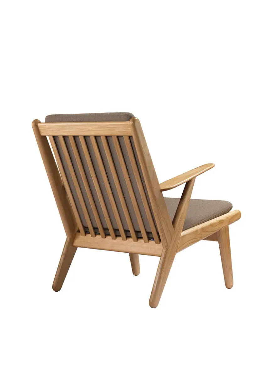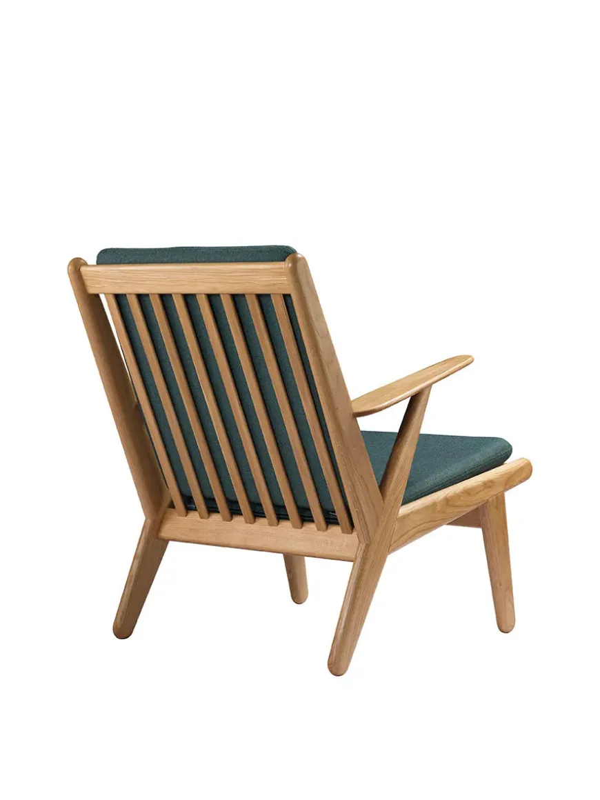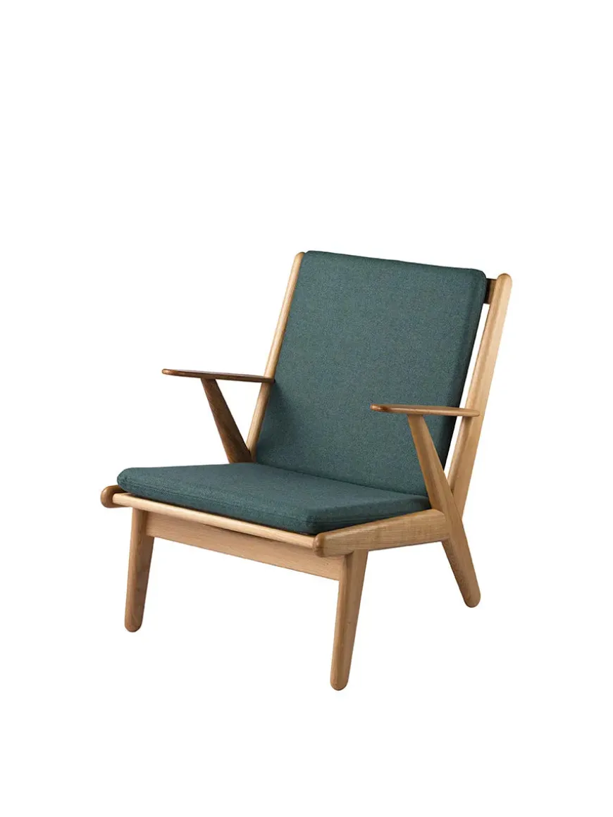 Lænestolen har hynder i fire forskellige farver, og stel i olieret egetræ.