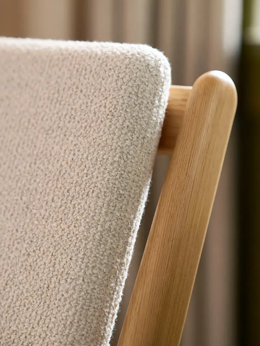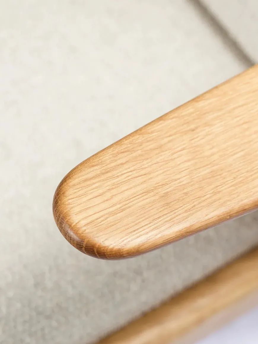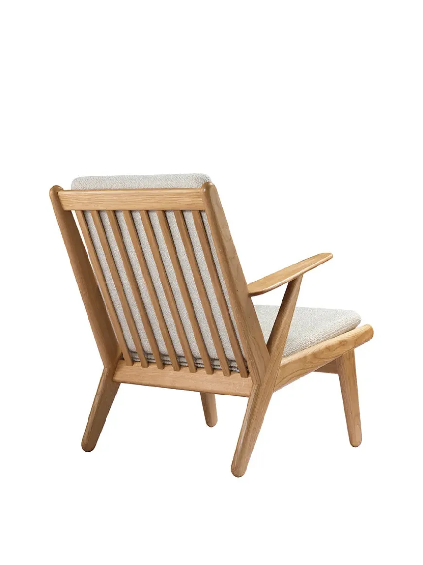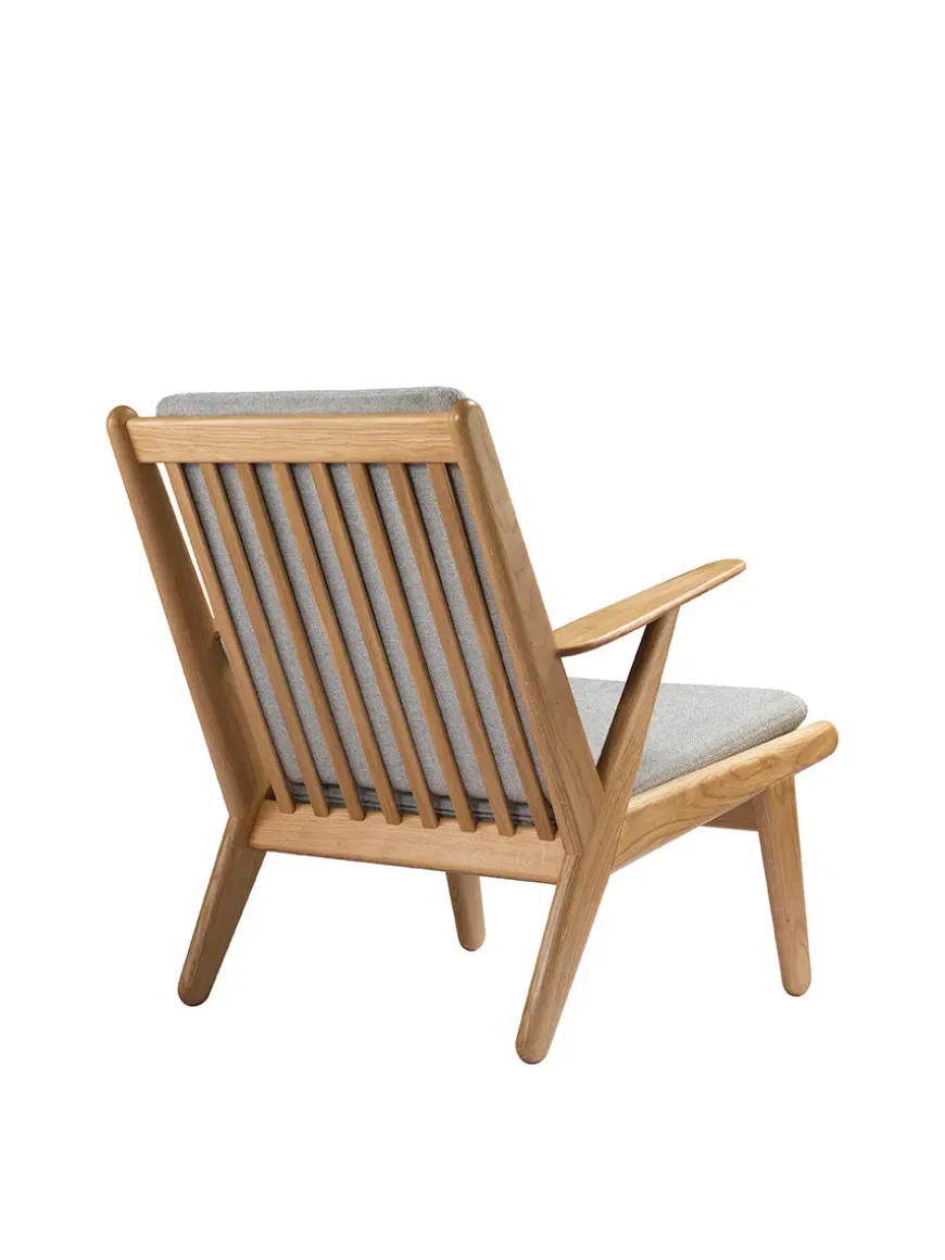 Lænestolen har hynder i fire forskellige farver, og stel i olieret egetræ.