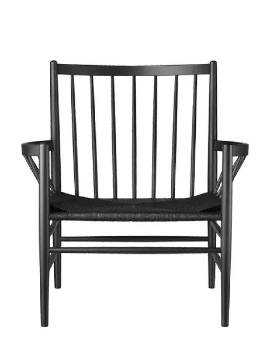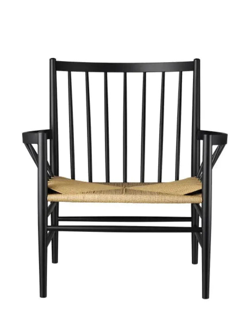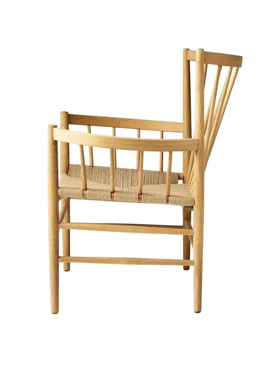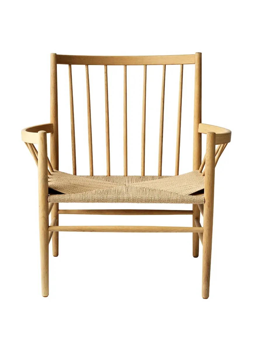 Loungestolen J82 er lavet i massiv eg eller bøg med håndflettet sæde i natur eller sort.