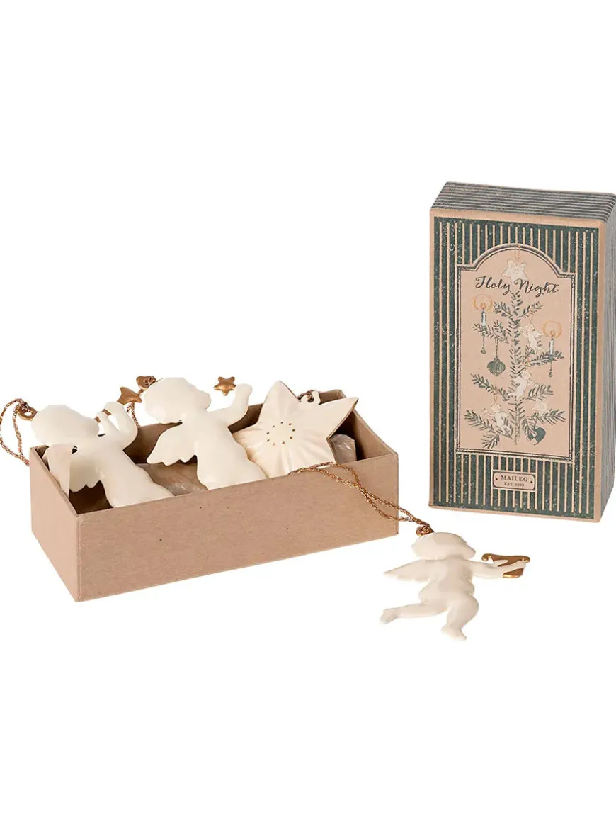En perfekt gaveæske, der indeholder 4 smukke Maileg ornamenter. Hvert ornament er pakket ind i silkepapir og pakket i en gaveæske dekoreret med Dorthe Mailils tegninger. Dette sæt indeholder 3 forskellige engle og en stjerne.