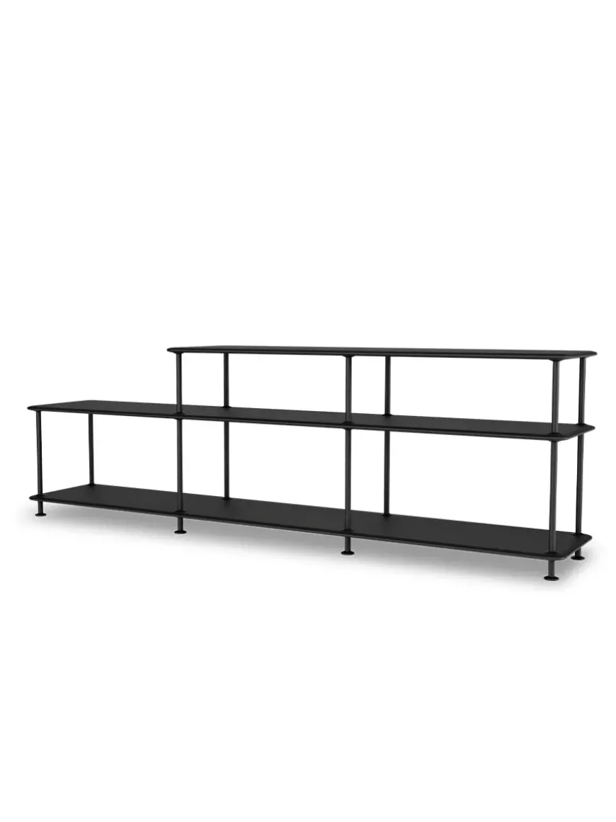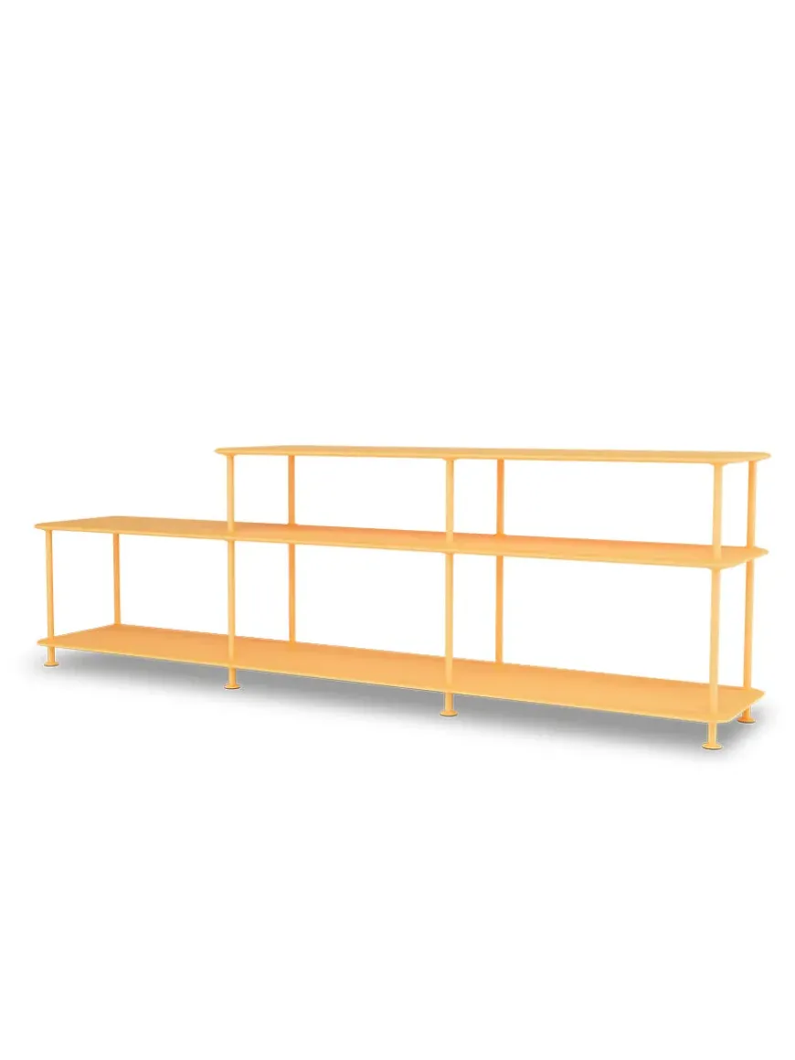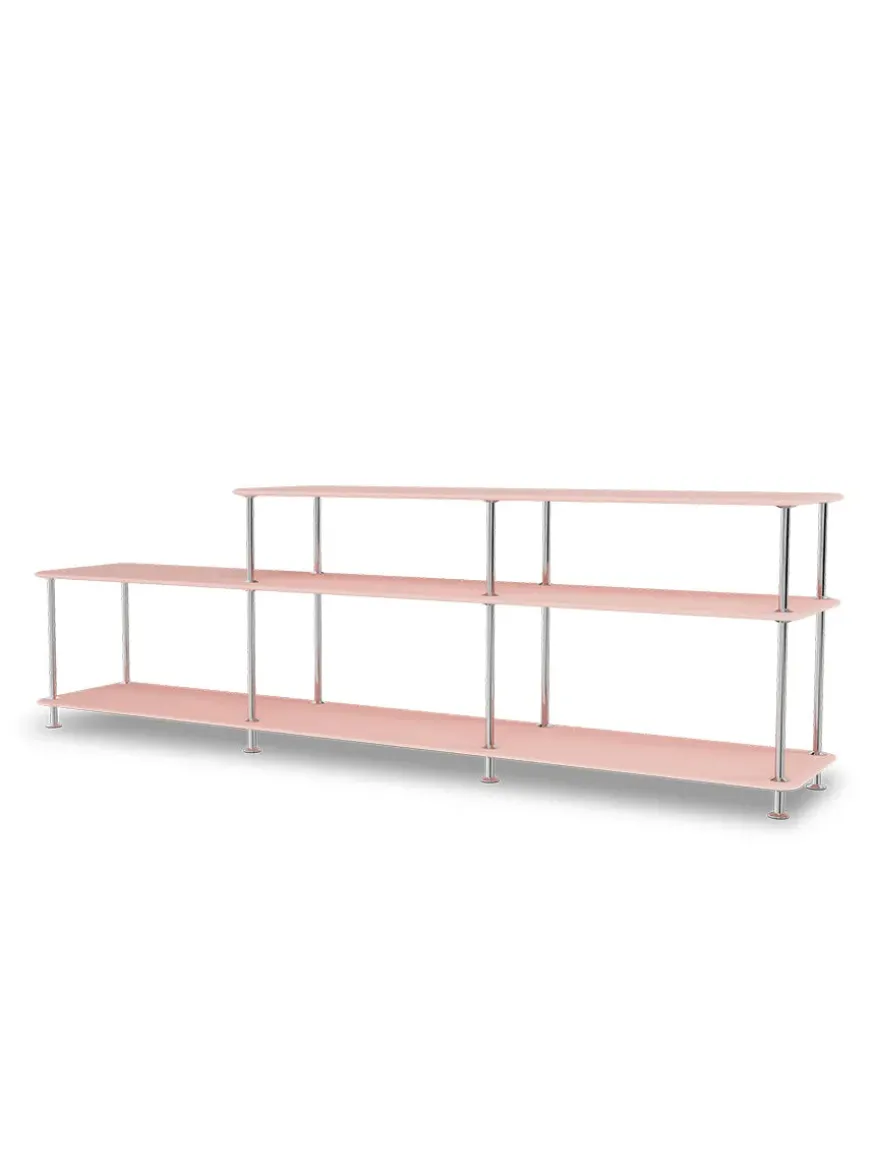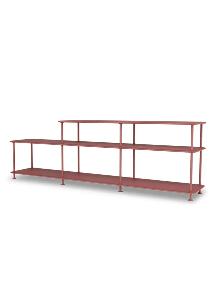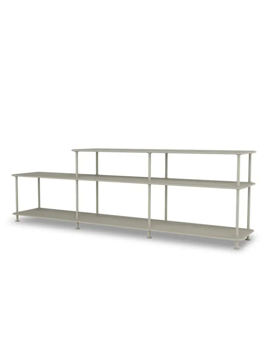 Montana Free reolsystemet er opbygget af lakerede MDF-hylder i dybde 38 adskilt af tynde stager, der giver et let og svævende udtryk og understreger de horisontale hylder.