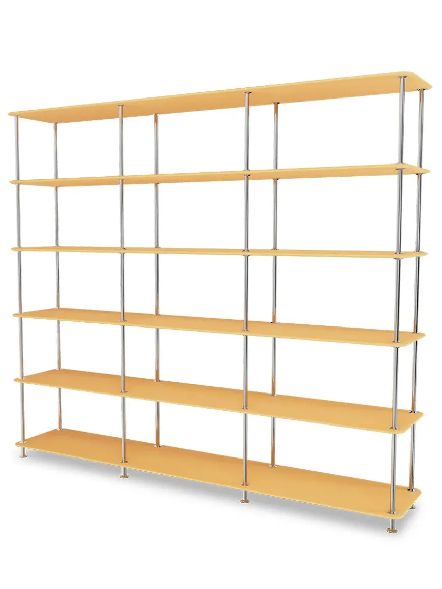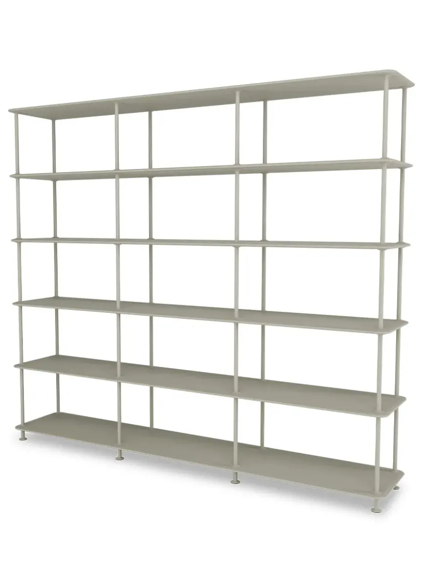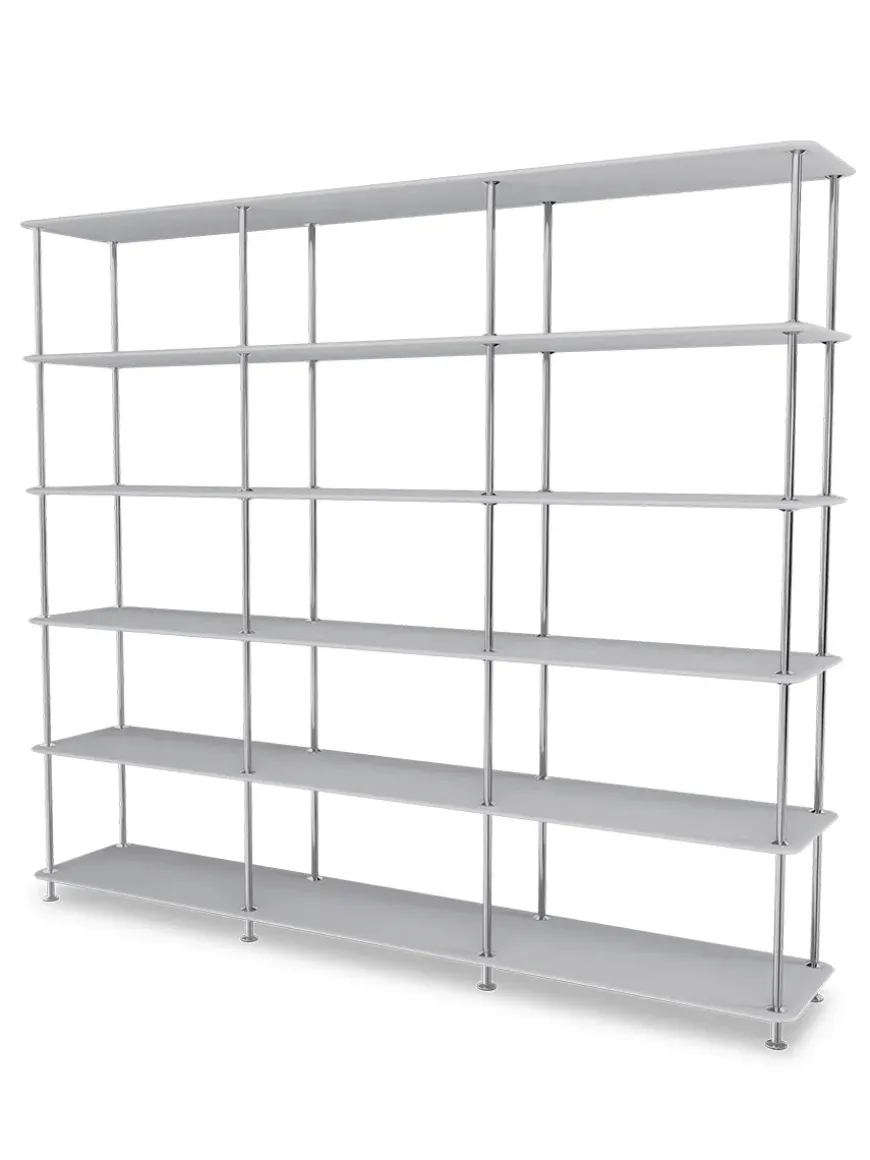 Montana Free reolsystemet er opbygget af lakerede MDF-hylder i dybde 38 adskilt af tynde stager i krom, der giver et let og svævende udtryk og understreger de horisontale hylder.