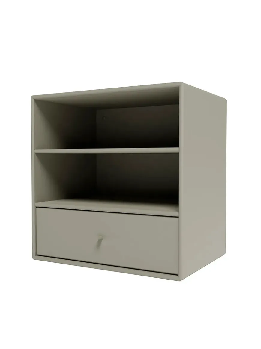 Montana Mini er en serie med mindre opbevaringsmoduler, som laves i 10 forskellige farver. Her finder du modulet med to rum og en skuffe nederst, som giver gode muligheder for opbevaring af diverse ting, eksempelvis i soveværelset, entréen eller stuen. Serien laves af 8 millimeter MDF modsat de 12 millimeter, som resten af Montanas reoler. Ophæng medfølger.