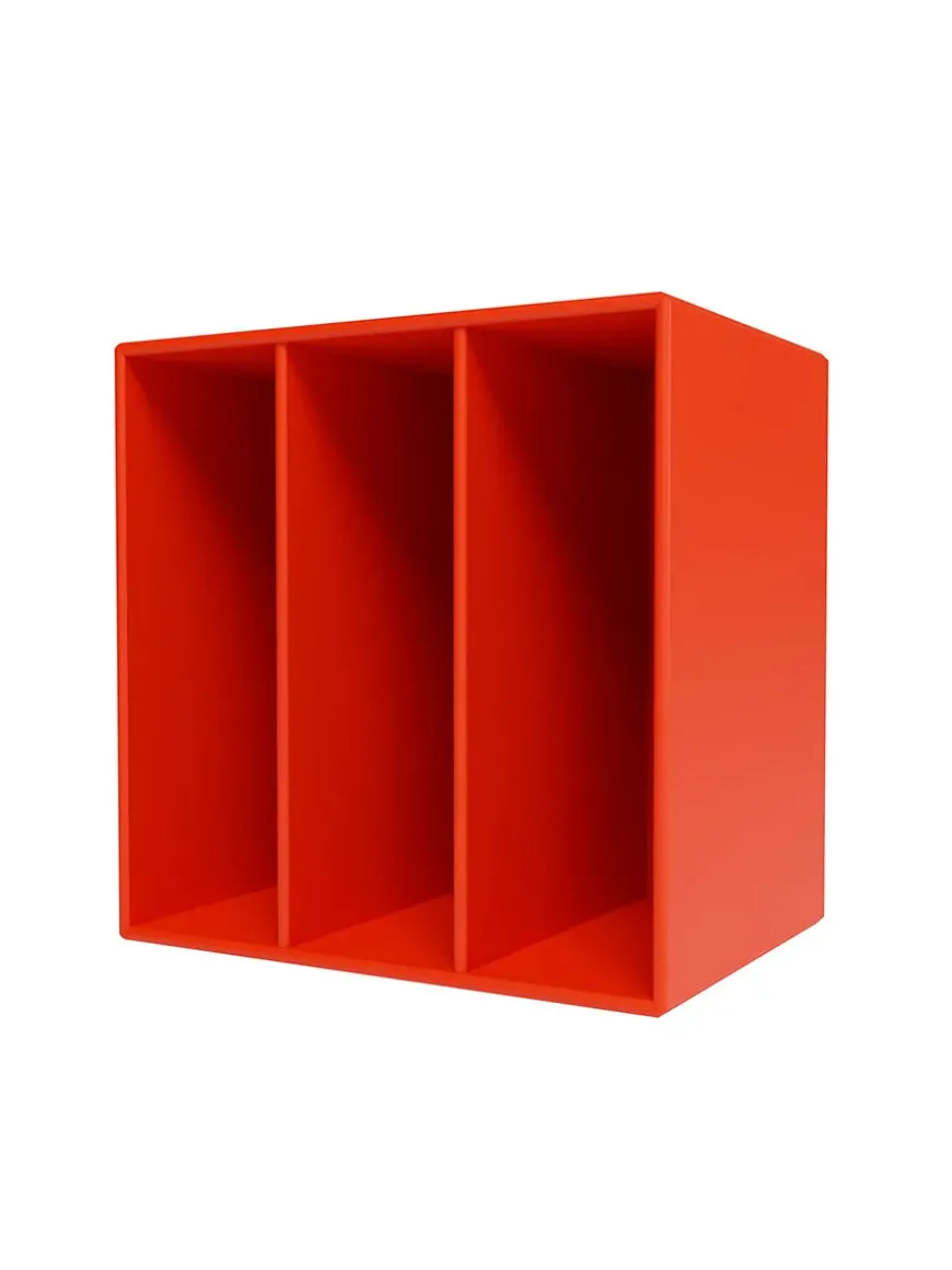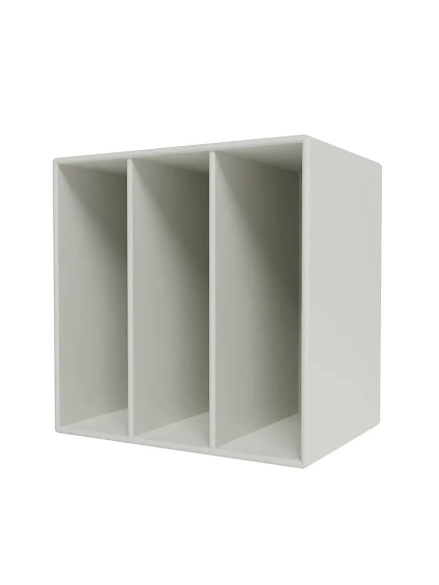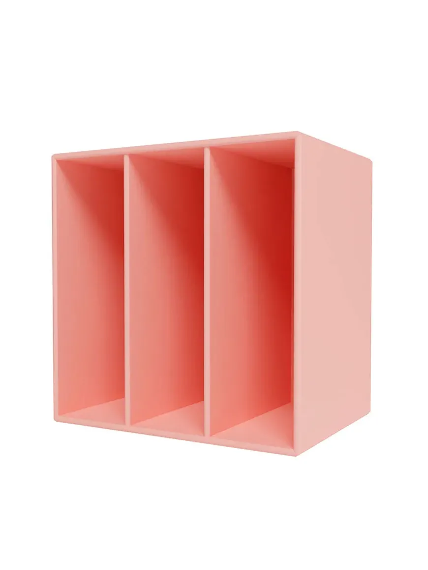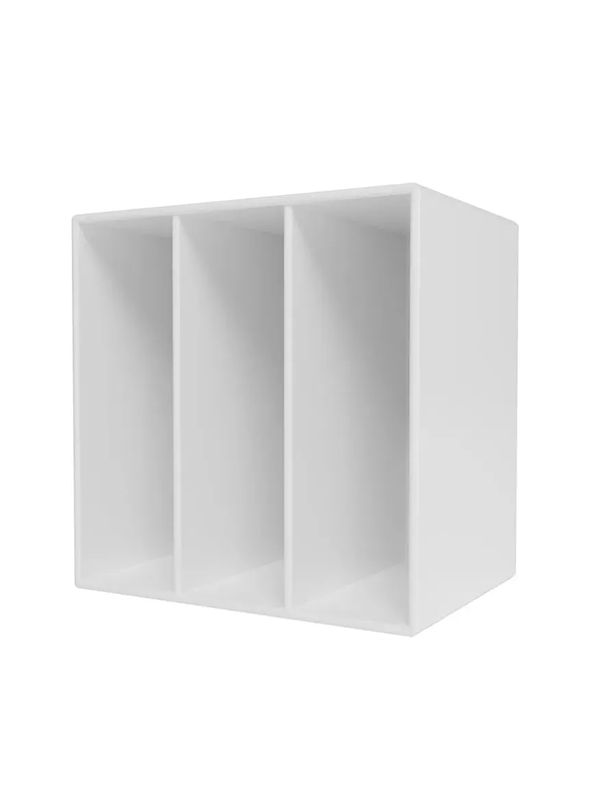 Montana Mini er en serie med mindre opbevaringsmoduler, som laves i 10 forskellige farver. Her finder du modulet med to skillevægge, som giver tre rum vertikalt, med gode muligheder for opbevaring af diverse ting, eksempelvis i soveværelset, entréen eller stuen. Serien laves af 8 millimeter MDF modsat de 12 millimeter, som resten af Montanas reoler. Ophæng medfølger.