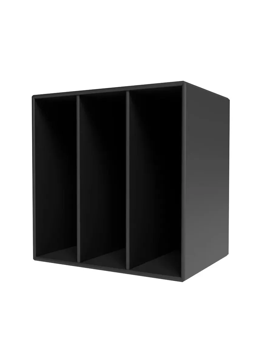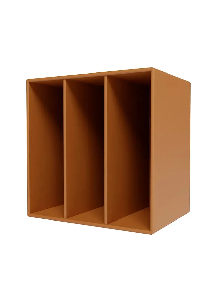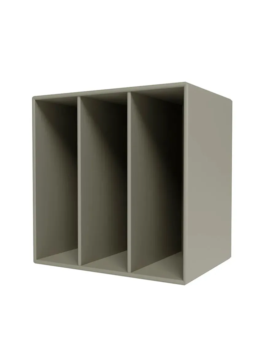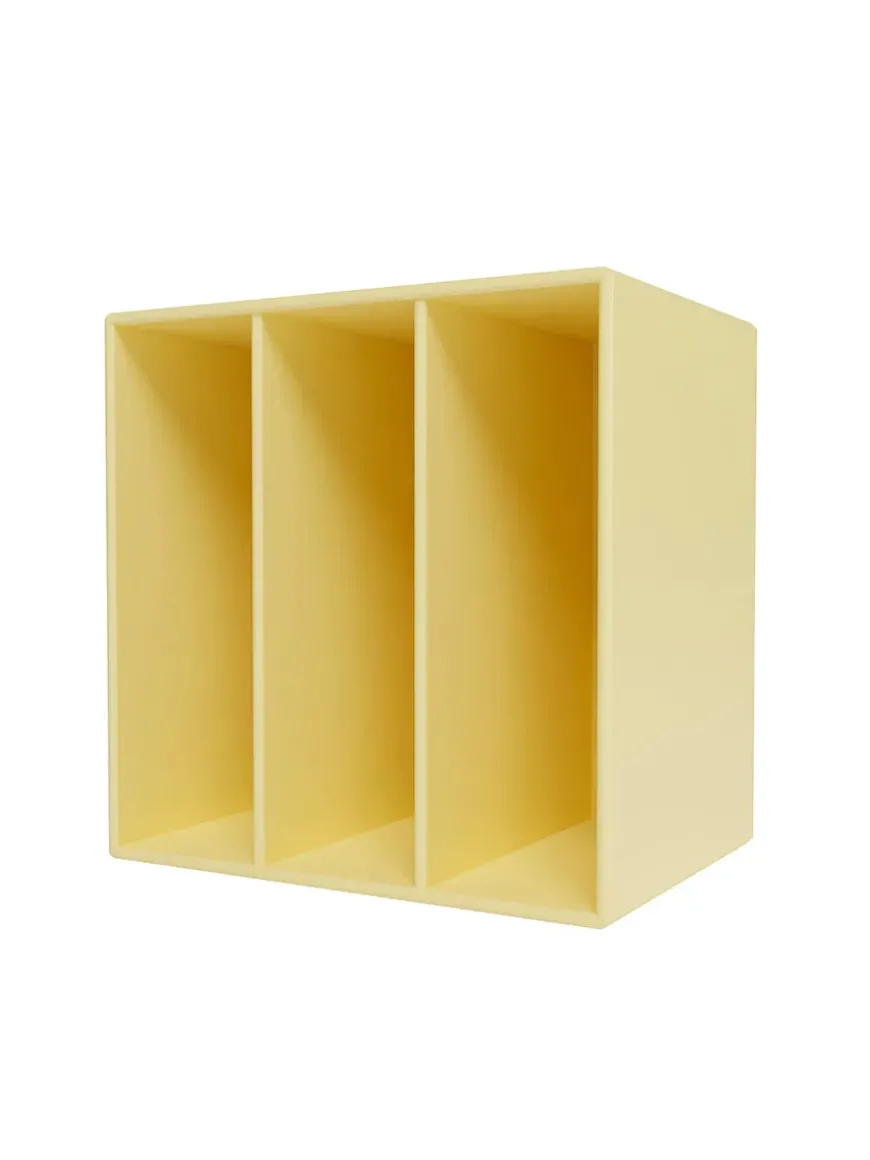 Montana Mini er en serie med mindre opbevaringsmoduler, som laves i 10 forskellige farver. Her finder du modulet med to skillevægge, som giver tre rum vertikalt, med gode muligheder for opbevaring af diverse ting, eksempelvis i soveværelset, entréen eller stuen. Serien laves af 8 millimeter MDF modsat de 12 millimeter, som resten af Montanas reoler. Ophæng medfølger.
