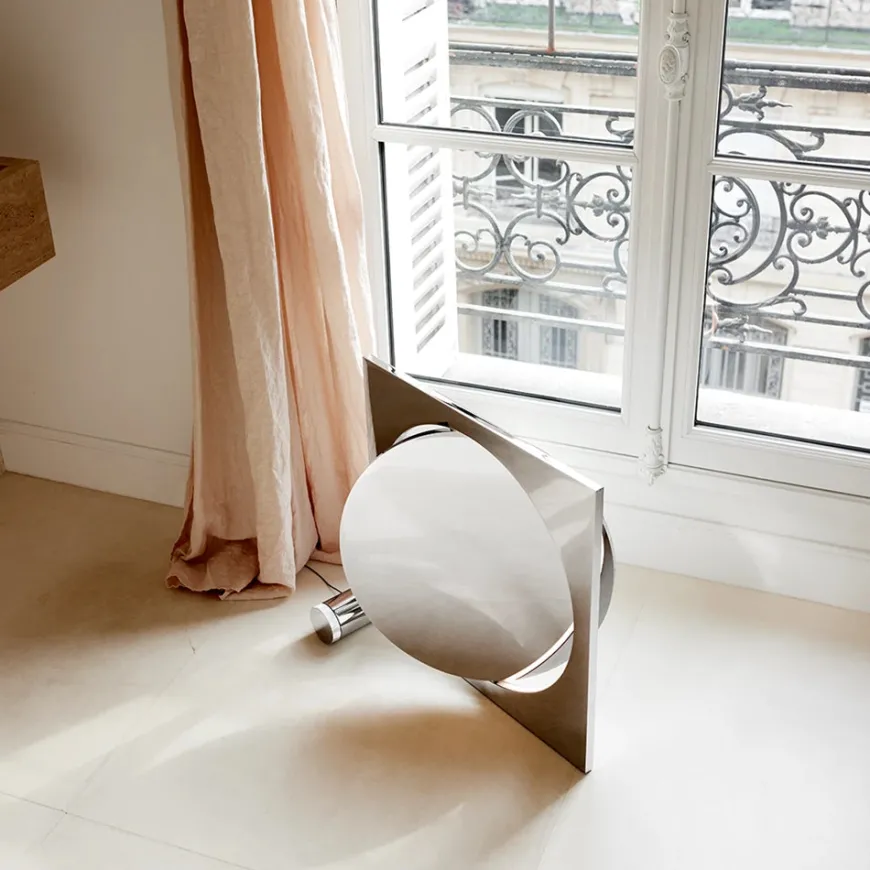 Den skulpturelle gulvlampe fra Louis Poulsen i forkromet aluminium har en roterende skive, der giver mulighed for tilpasning af reflektionen af det blændfri lys fra LED-lyskilden, som sidder elegant nedsænket i standeren. Skiven roterer 360° om sig egen akse og er hvid på den ene side og reflekterende på den anden. Når lyset vippes mod den hvide side, bliver det blødt og diffust, hvorimod den modsatte forkromede side reflekterer lyspanelet direkte og giver et helt andet indtryk. Lyset afhænger af skivens position. Omgivelserne afspejles i standeren og skivens forkromede side. Lampen tilbyder trinløs dæmpning og tændes og slukkes ved at rotere fodkontakten på cylinderen.