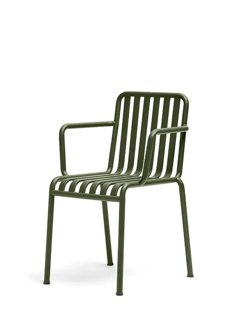 Den smukke Palissade stol med armlæn. Havestolen laves i farverne olive, sky grey, anthracite eller hot galvanised. Brug evt. stolen på terrassen eller i haven sammen med de smukke Palissade borde, som du kan se nedenfor.