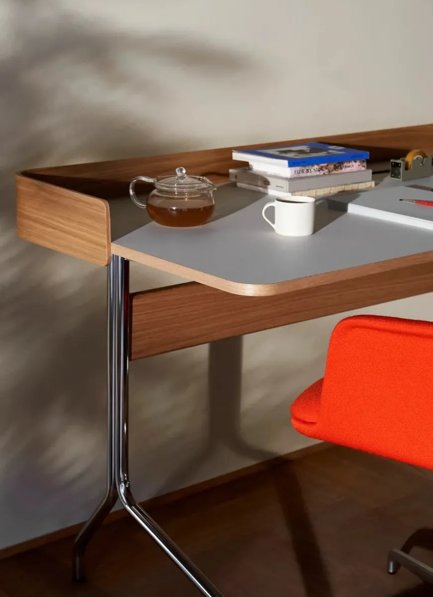 Pavilion AV16 skrivebord er tegnet af design duoen Anderssen & Voll i 2020. Det fine skrivebord er lavet med en linoleum bordplade med kant i eg eller valnød finér. Stellet er lavet i stål.