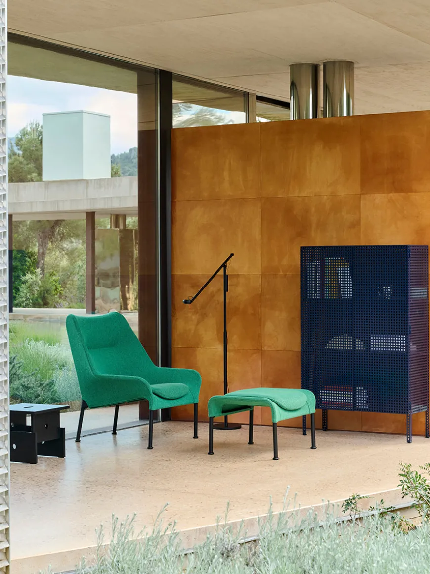 Perforated Cabinet Floor i medium er en alsidig opbevaringsløsning designet af Muller Van Severen for HAY. Det perforerede mønster i pulverlakeret stål giver skabet et let og moderne udtryk, hvor indholdet skjules delvist uden at virke tungt i rummet.