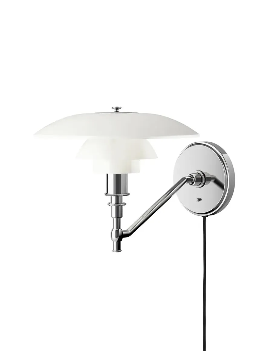 PH 3/2 Væg PH 3/2 væg er medlem af 3-skærms familien, der i dag tæller 20 lamper, heraf 3 til udendørs brug. Poul Henningsen designede 3-skærmssystemet allerede i 1925-1926, hvor PH i samarbejde med Louis Poulsen tegnede de første lamper til en udstilling i Paris. Gennem hele sit liv søgte PH at skabe det blændfri lys, rette lyset hen, hvor der var brug for det og skabe bløde skygger. PH designede således ikke blot en lampe, men et helt system, og der blev igennem årene produceret omkring tusind forskellige modeller.