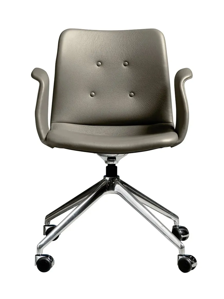 Den karakteristiske ryg bøjer sig let og tilpasser sig brugerens rygsøjle, hvilket giver optimal støtte gennem hele arbejdsdagen. Sæde og ryg er polstret med formstøbt koldskum og betrukket med eksklusive tekstiler eller læder. Det firestjernede stel i poleret eller sortlakeret aluminium sikrer stabilitet og er ikke drejeligt.