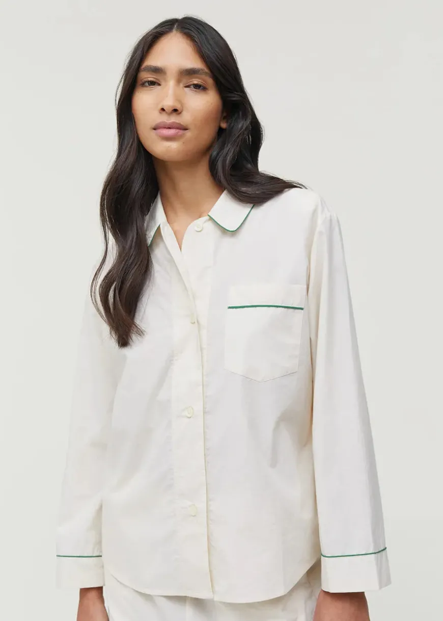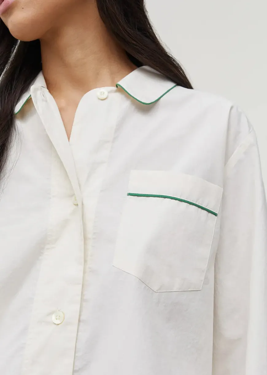 Et to-delt natsæt med skjorte og bukser. Skjorten har en fin v-udskæring og bukserne er med løse, lige ben og med elastik i livet. Hop i den fine pyjamas, når du skal slappe af hjemme.