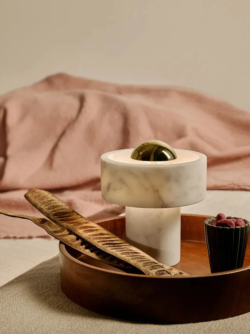 Stone Portable Bordlampen af Tom Dixon er en moderne og sød lampe, der er let at passe ind i de fleste hjem og indretninger. Stone Portable lampen er udført i hvid marmor, og med en messingtop, hvorfra lyset kommer ud. Den lyse marmor står i flot kontrast til den kolde marmor. Lampen er med indbygget LED og kan lyse i op til 9 timer på en enkelt opladning.
