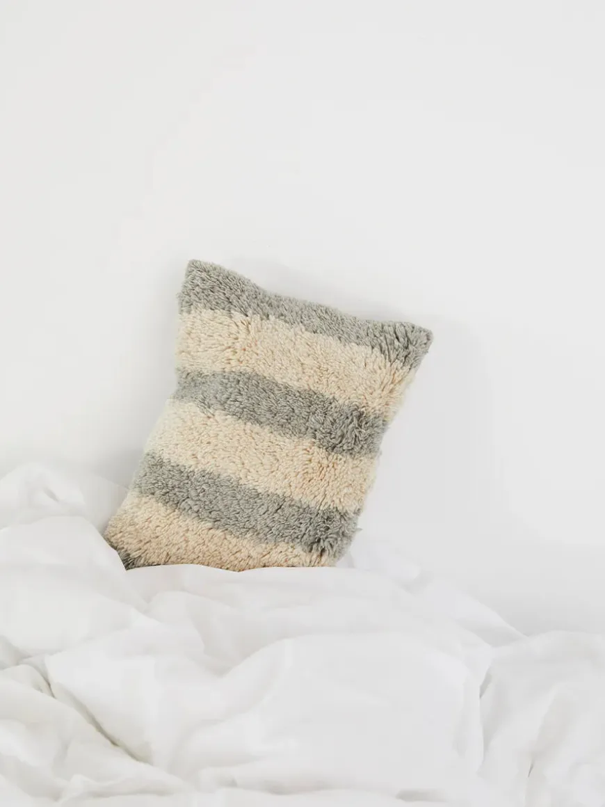 Stripe Nepal er en pude med masser af personlighed. Puden er håndvævet i Kathmandu af lokal tibetansk fåreuld, og bagsiden er af 100% GOTS-certificeret bomuld. Udført med vertikale striber i bløde, afdæmpede farver. Lukkes med overlappende stof, og bærer et håndbroderet Aiayu-logo på bagsiden.