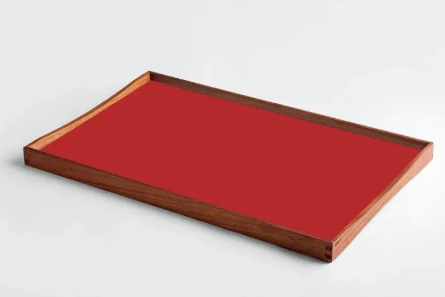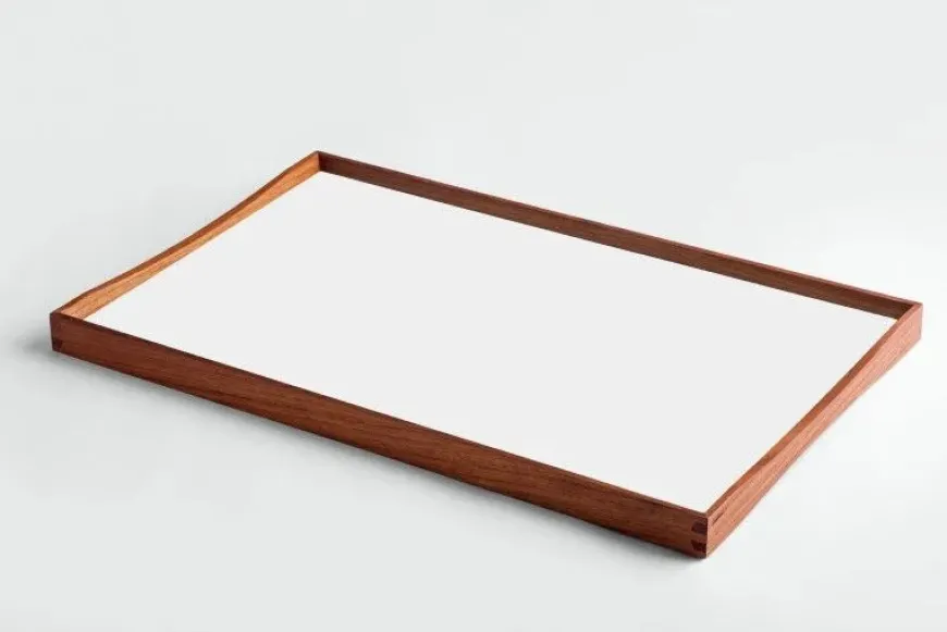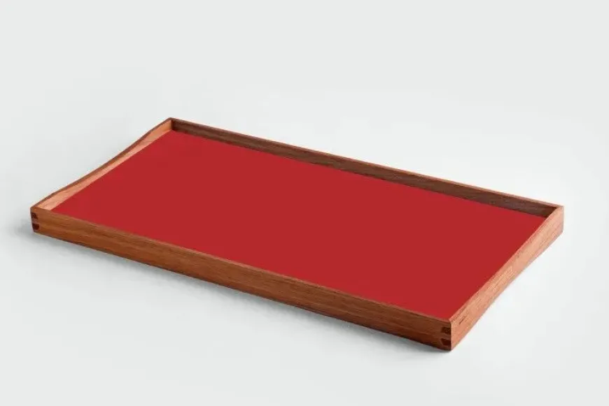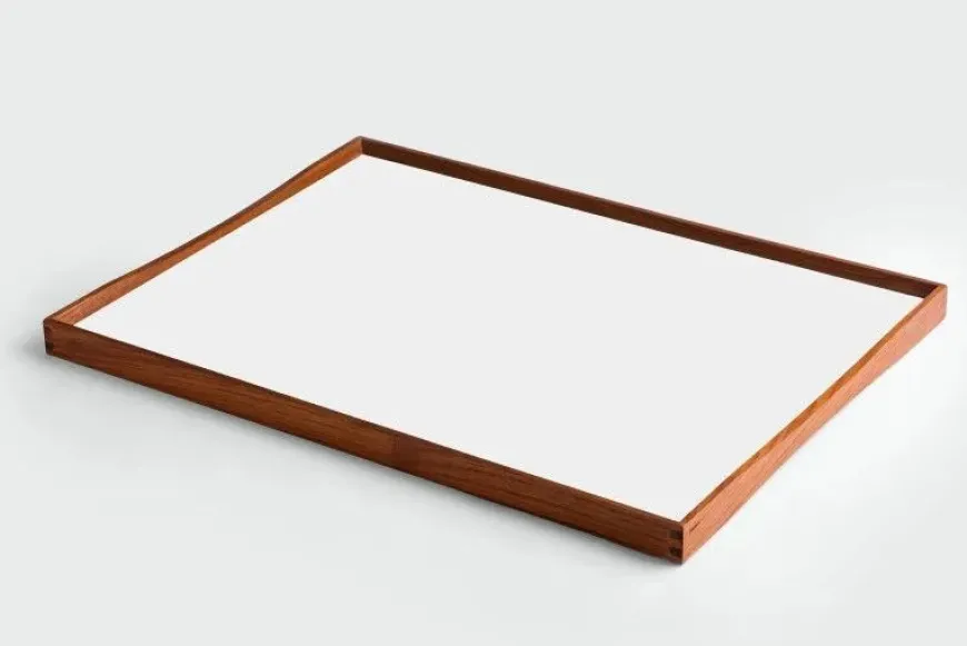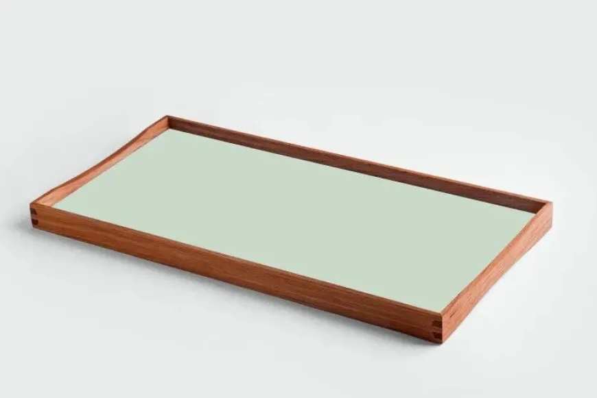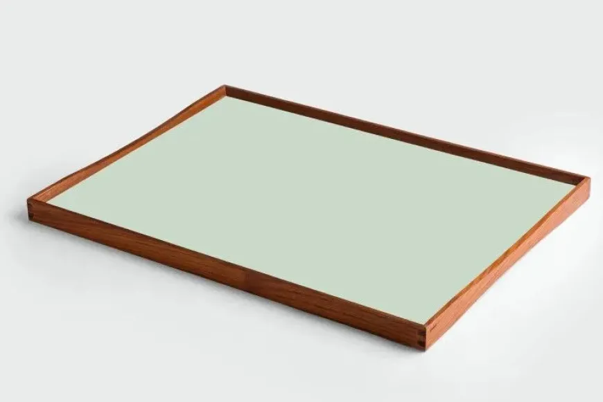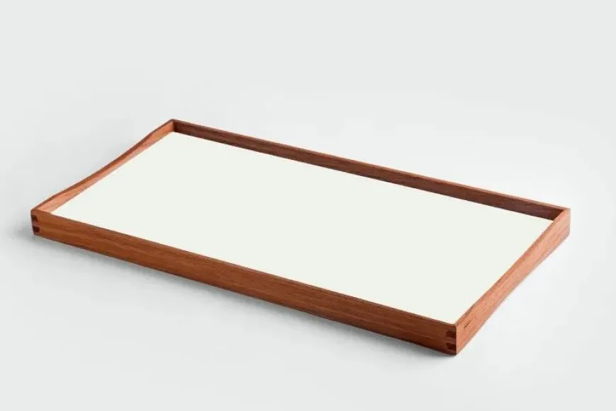 Turning Tray blev designet i 1956 af Finn Juhl og er fremstillet med den kurvede teaktræsramme og præcise hjørnesamlinger, der er blevet hans varemærke. Bakken er uden håndtag, men dens kurver gør, at der er plads til at alle størrelser hænder, fra børn til voksne, kan løfte den. Turning Tray er, som navnet antyder, tosidet med blanke laminatsider, der holdes sammen af den smukke teaktræsramme.
