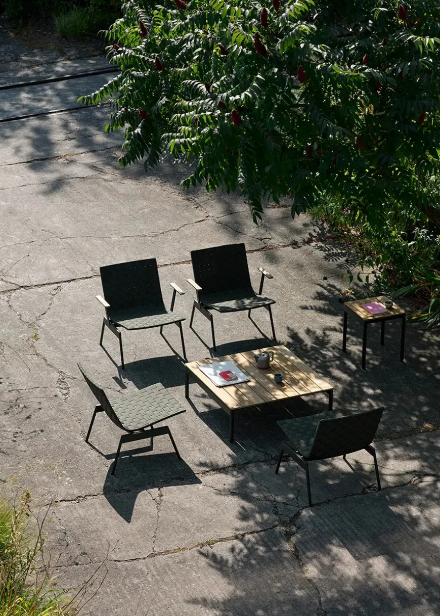 Teaktræet kan behandles med olie, men klarer sig også fint uden behandling, og vil med tiden opnå et sølvgråt udseende. Ville bordet har stel i enten sort eller grønt pulverlakeret stål. Ville AV50 er perfekt til at skabe hyggelige loungeområder sammen med Ville Loungestolene.