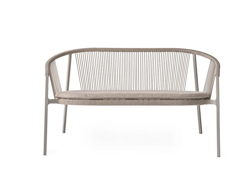 Den lette, men robuste ramme i pulverlakeret aluminium er omkranset af flettet reb, som giver et luftigt og dekorativt look. Overfladen er modstandsdygtig over for både ridser og falmning, hvilket sikrer, at sofaen holder sig pæn sæson efter sæson.
